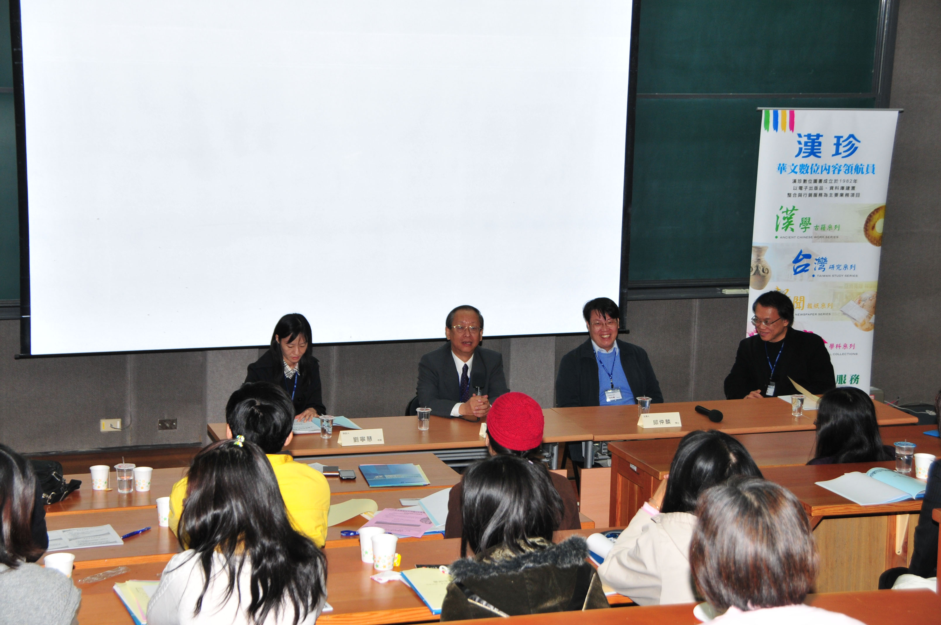2008年11月30日在台湾大学体育馆会议厅举行“古籍数字化与中国基本古籍库研讨会”,会议由台湾汉珍数字图书有限公司主办,中央研究院和台湾大学、元智大学、台北大学、彰化师院等十多个单位的70余位代表出席。爱如生总顾问刘俊文教授应邀在会上做了“论中国古籍数字化”讲演,并就中国基本古籍库的相关问题回答了大家的咨询,受到热烈欢迎。图为大会会场和演讲实况。