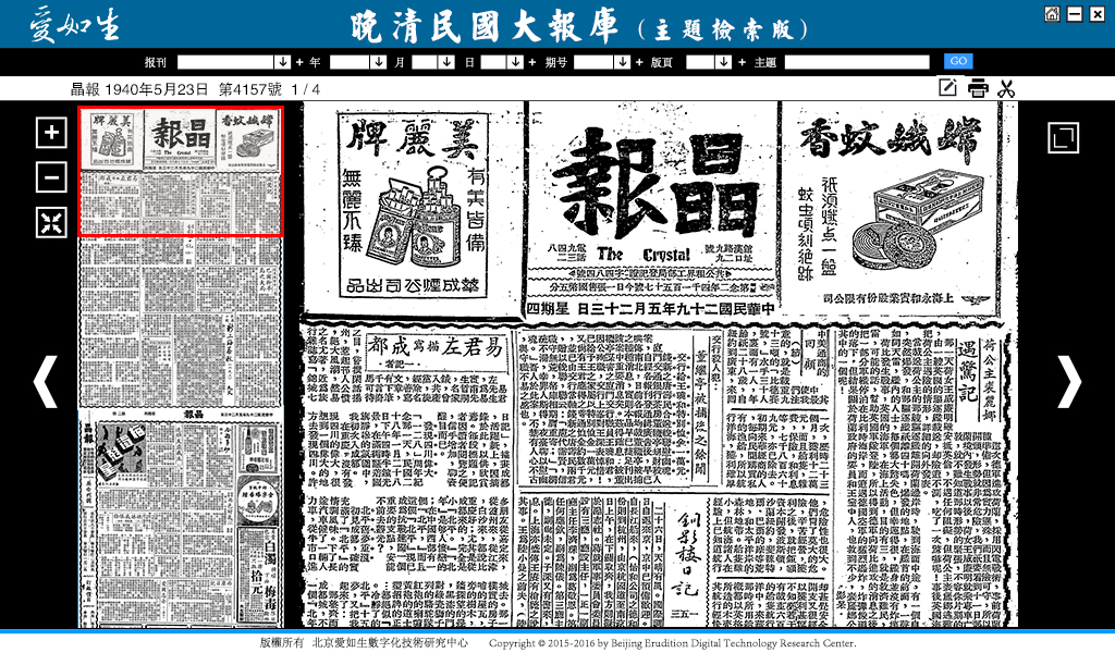 晚清民国大报库收录的晶报,自1919年3月3日创刊至1940年5月23日终刊共4202号,首尾连贯,完整无缺。