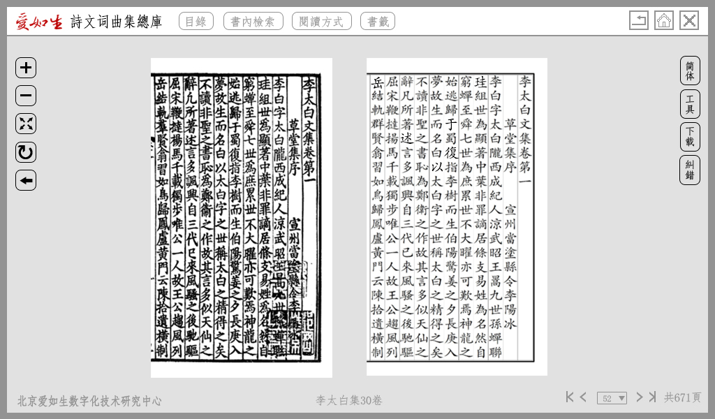 技术特点:诗文词曲集总库所收二万六千种典籍,均采用宋元明清及民国各级善本,以爱如生独有之数字再造技术制作。还原式页面,左图右文逐页对照;原书之版式及眉批、夹注、图表、标记等无障碍录入,并在原位置非嵌入式显示,全息再现。同时配备爱如生自主研发的检索系统和功能平台,可以进行毫秒级、可导出之海量全文检索和校勘、标点、编辑、复制等一站式整理研究作业。可谓文化之宝山,研习之利器。