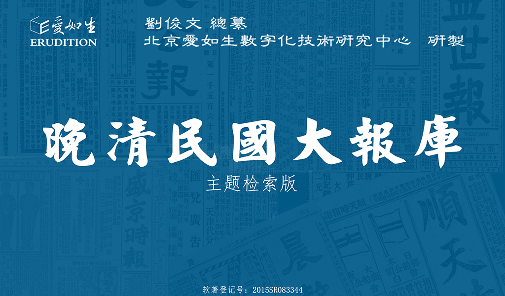 晚清民国大报库(主题检索版)是精选晚清和民国时期重要报纸的主题检索版大型近代文献数据库,由刘俊文总纂,北京爱如生数字化技术研究中心研制。