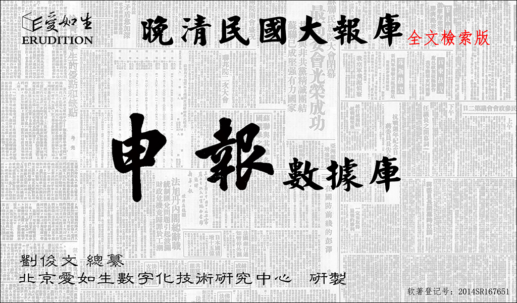 申报数据库是以民国时期最大报纸申报为内容的全文检索版大型近代文献数据库,由刘俊文总纂,北京爱如生数字化技术研究中心研制。