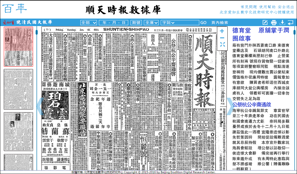 晚清民国大报库收录的顺天时报,自1905年8月22日创刊至1930年3月27日终刊,现存共7768号。