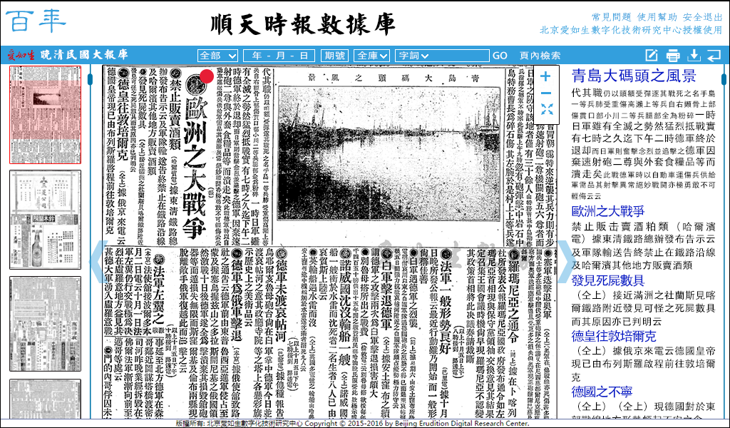 顺天时报数据库是以清末民初日系报纸顺天时报为内容的全文检索版大型近代文献数据库,由刘俊文总纂,北京爱如生数字化技术研究中心研制。