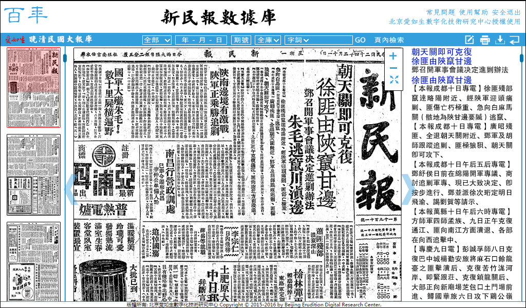 晚清民国大报库收录的新民报,收录新民报南京版,自1929年9月9日创刊至1948年6月30日停刊,现存共3080号。