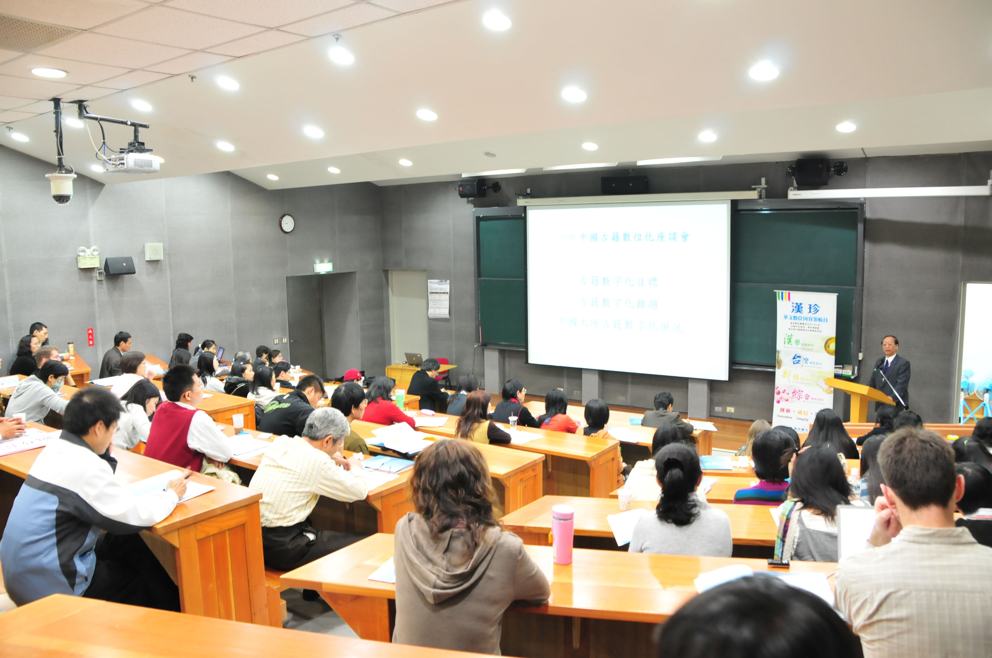 2008年11月30日在台湾大学体育馆会议厅举行“古籍数字化与中国基本古籍库研讨会”,会议由台湾汉珍数字图书有限公司主办,中央研究院和台湾大学、元智大学、台北大学、彰化师院等十多个单位的70余位代表出席。爱如生总顾问刘俊文教授应邀在会上做了“论中国古籍数字化”讲演,并就中国基本古籍库的相关问题回答了大家的咨询,受到热烈欢迎。图为大会会场和演讲实况。