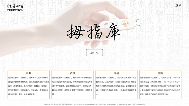 爱如生拇指库(古籍编),是专为个人使用者研发的离线独享微型古籍数据库。因采用拇指大小的 U 盘为载体,故名拇指数据库。具有抗病毒、防拷贝、免安装、便携带等优点,可即插即用,移动办公,不受场地和网络的限制,堪称随身研究室。