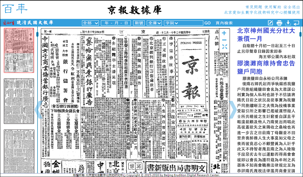 晚清民国大报库收录的京报,收录现存自1919年2月6日至1937年7月28日共5222号。
