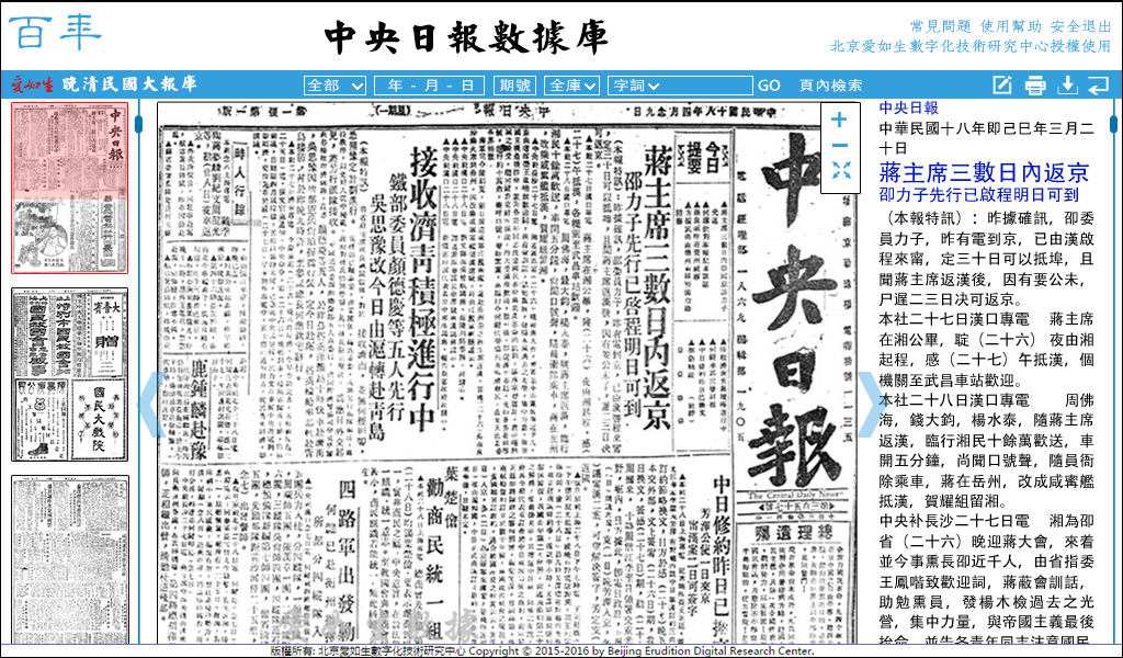 晚清民国大报库收录的中央日报,自1928年2月1日创刊至1949年4月24日终刊,现存共7300号。