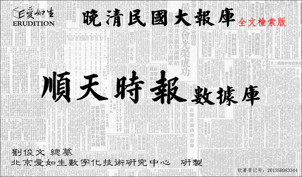 顺天时报数据库是以清末民初日系报纸顺天时报为内容的全文检索版大型近代文献数据库,由刘俊文总纂,北京爱如生数字化技术研究中心研制。