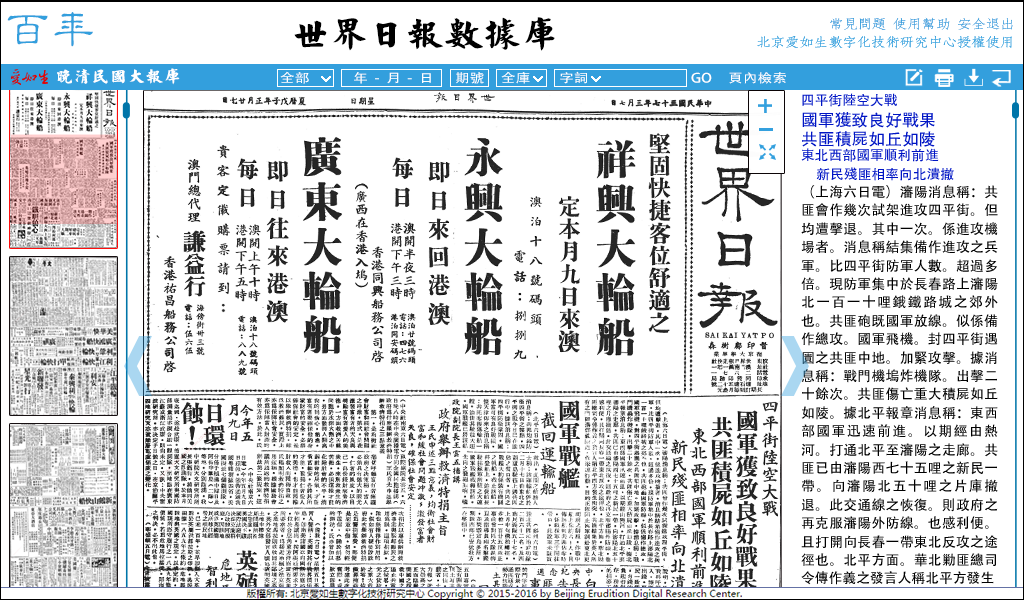 晚清民国大报库收录的世界日报,自1925年2 月10日创刊至1937年8月停刊,现存共3454号。
