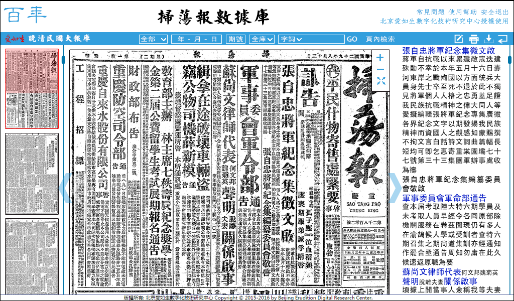 晚清民国大报库收录的扫荡报,自1932年6月23日定名至1945年11月12日改名,包括南昌版、汉口版、重庆版,现存共2647号。